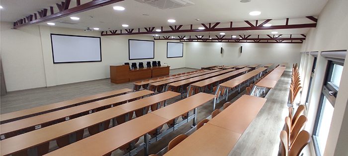 A state of the art amphitheatre venue equipped with 3 projectors, a portable touch screen laptop, portable and desktop microphones connected to the sound system and central heating/cooling system.